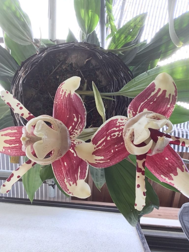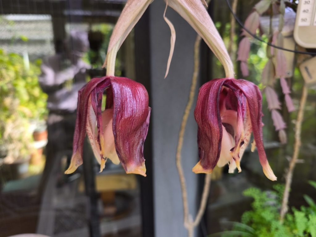 栽培下では、夏の終わりに花を付けることがある。 日中、バニラ系の強い匂いを発する。 花径は17cmあまりあり、弁質も厚いので見ごたえがあるが、非常に複雑な形をしていて、美しさよりも珍奇な印象を受ける。惜しむらくは花命が短く、3日ほどでしぼんでしまう。そのため、展示会などに出てくることは希であるが、展示されると必ず人だかりができるほど、強烈なインパクトがある。